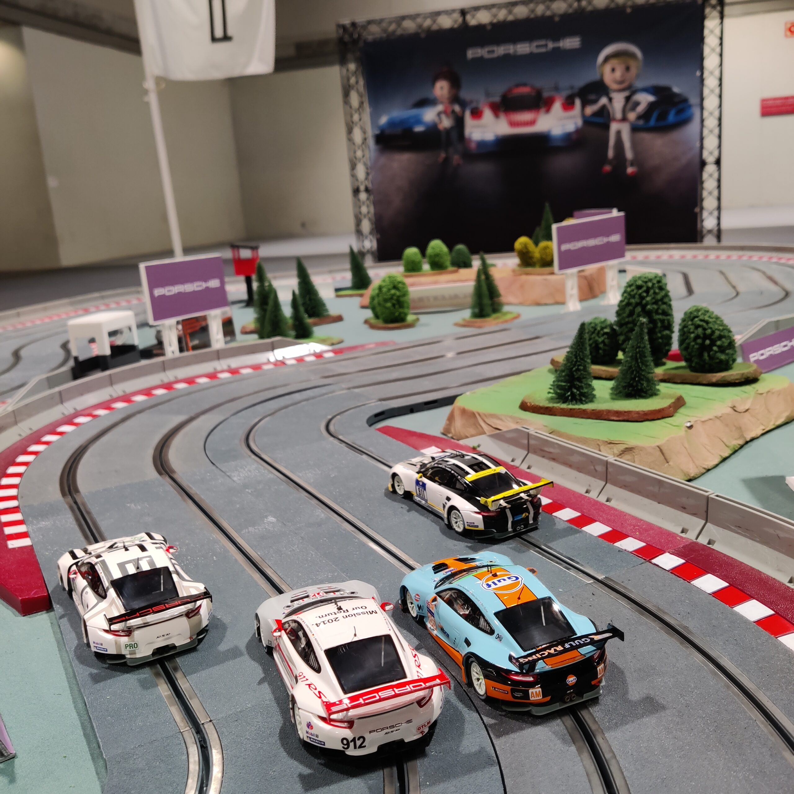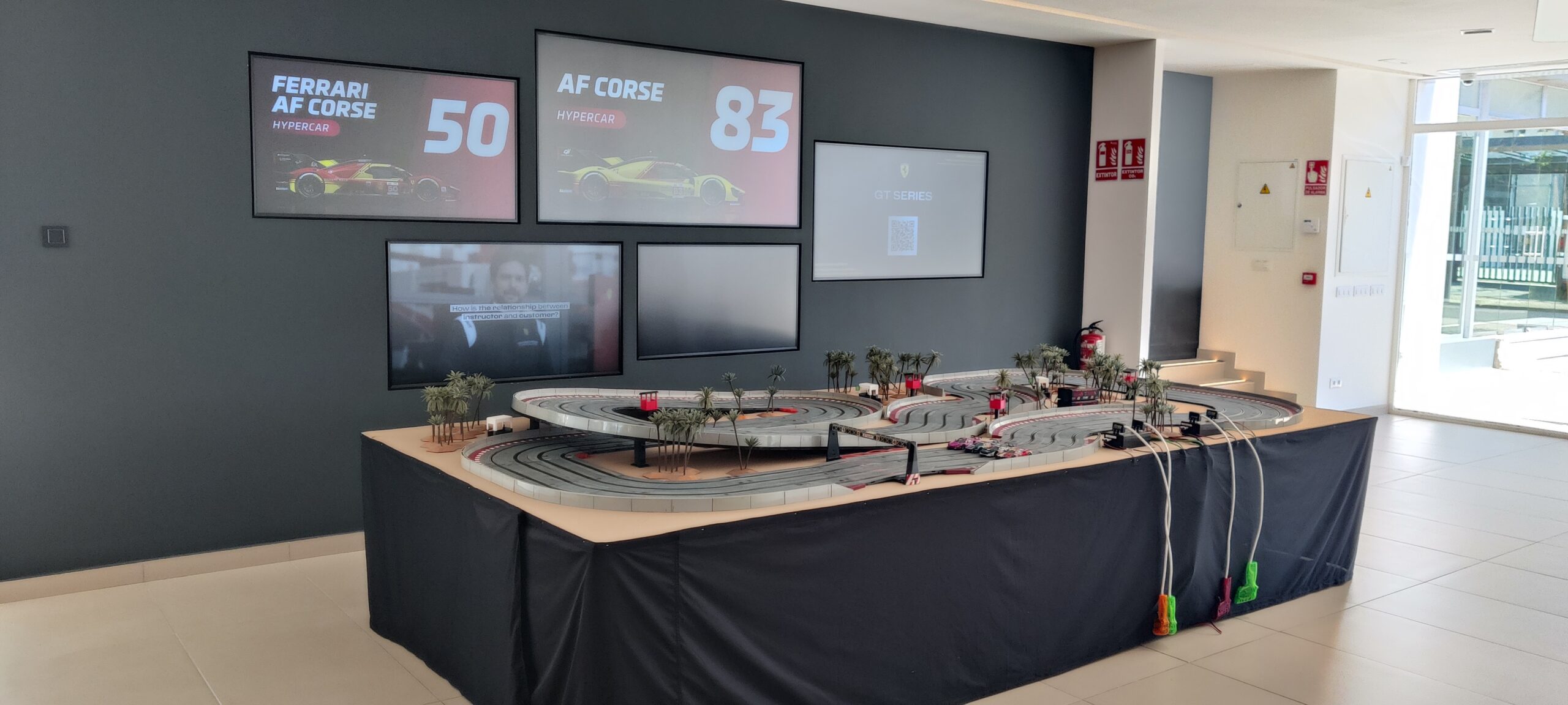 Ofrecemos grandes pistas de scalextric para cuatro pilotos con sistema electrónico para organizar carreras y el personal para la gestión de la actividad, posibilidad de usar cualquier tipo de vehículos: coches, motos, fórmula 1.